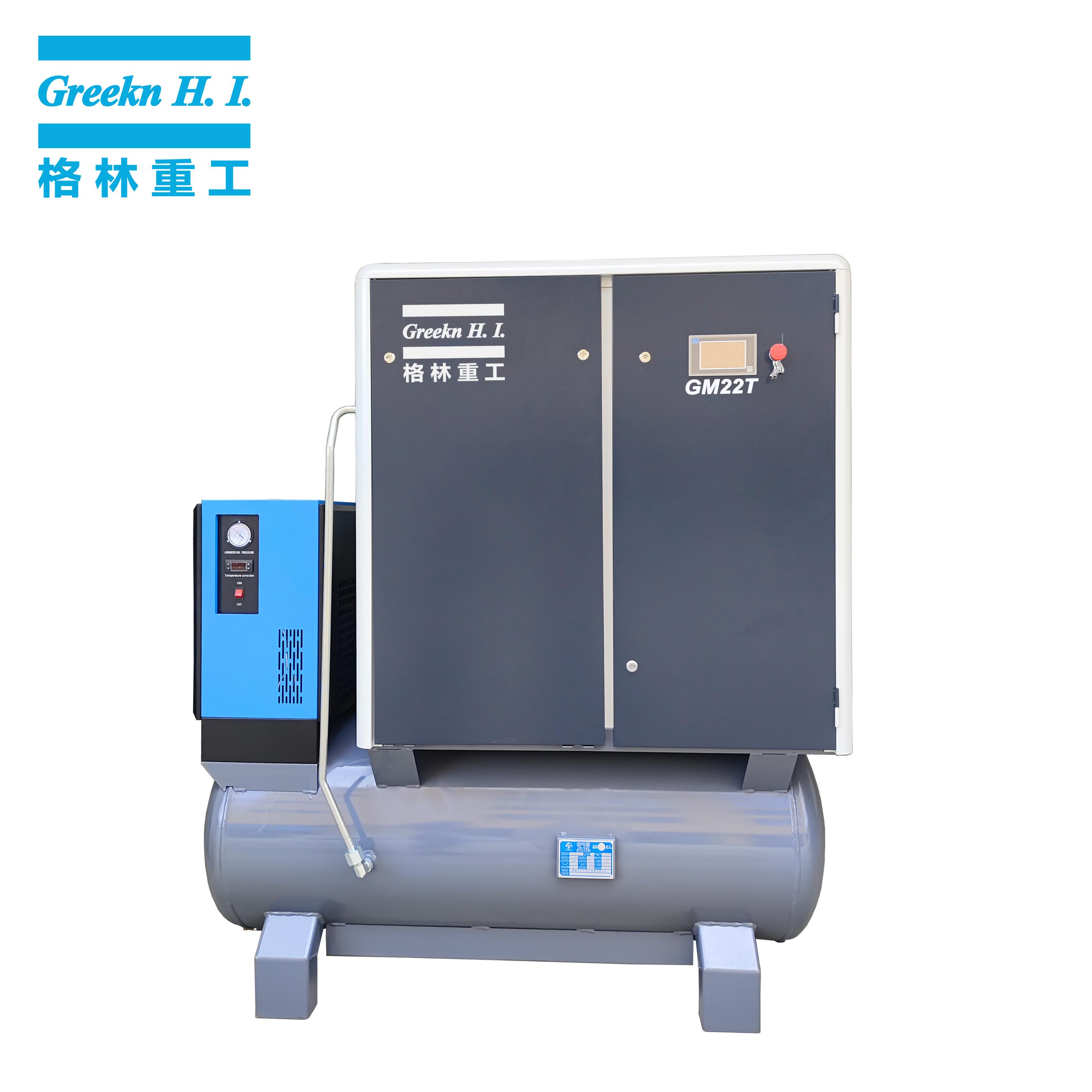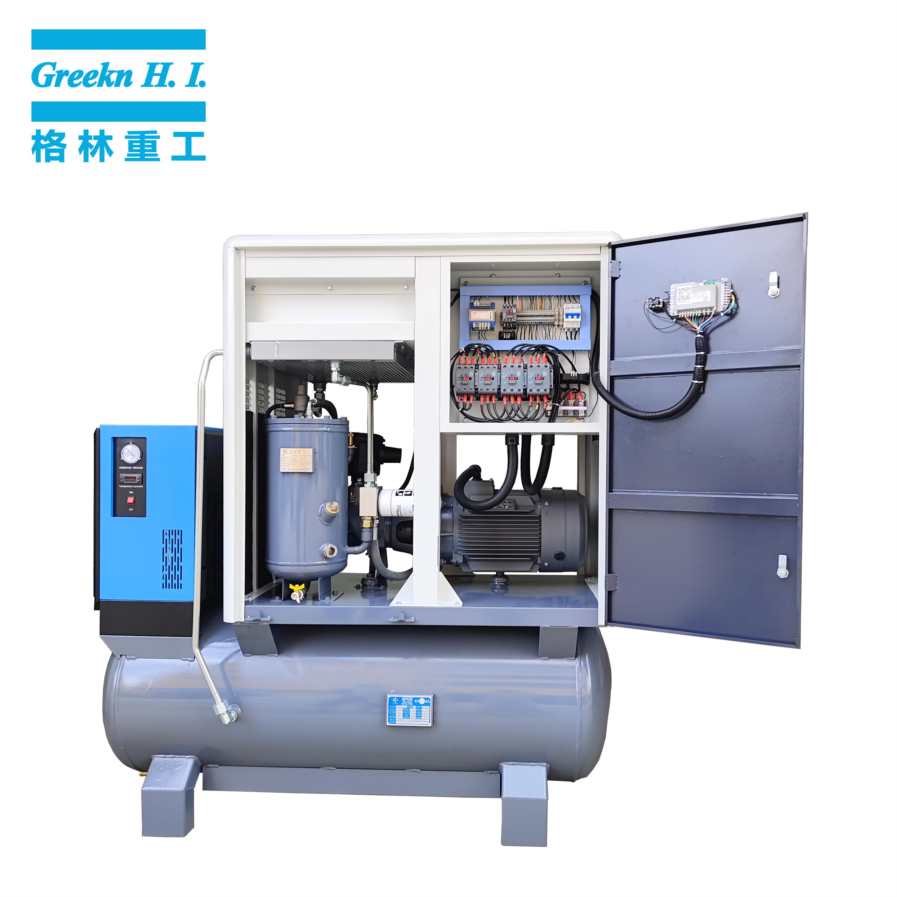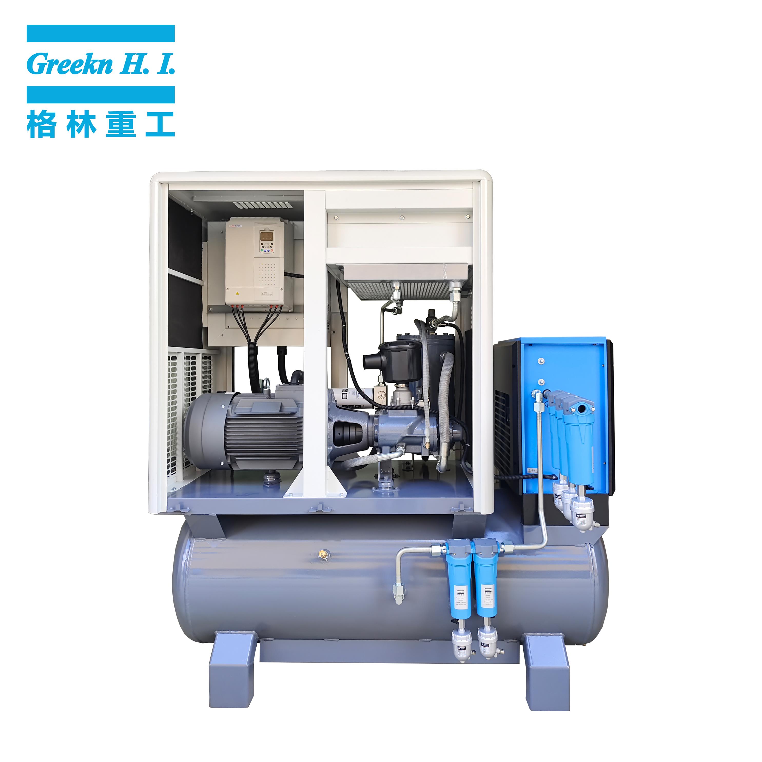 *全能集成式螺杆空压机,将空压机,储气罐,冷干机,过滤器集成于一体,占地空间小,用户无需安装连接管路,移动方便,操作简单。