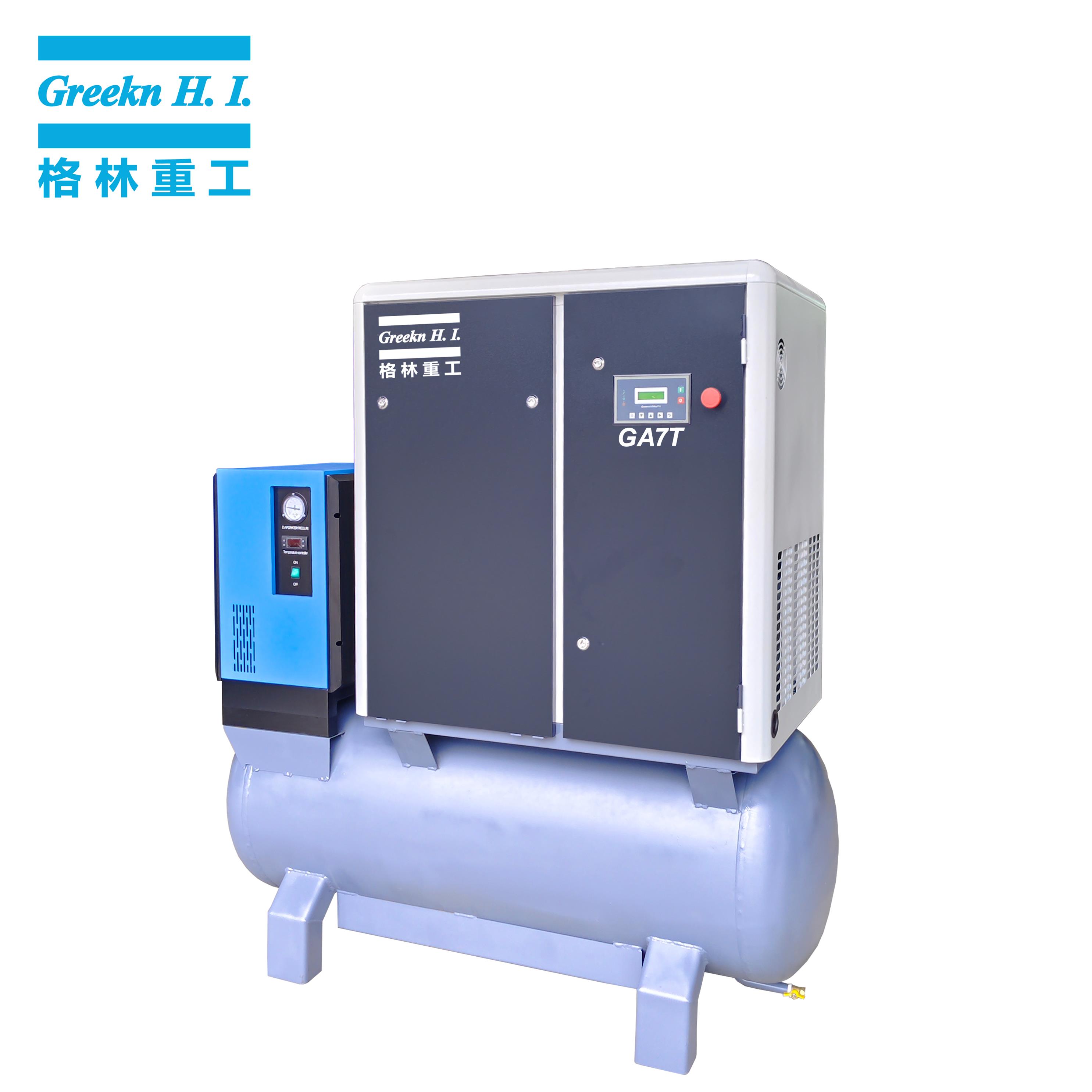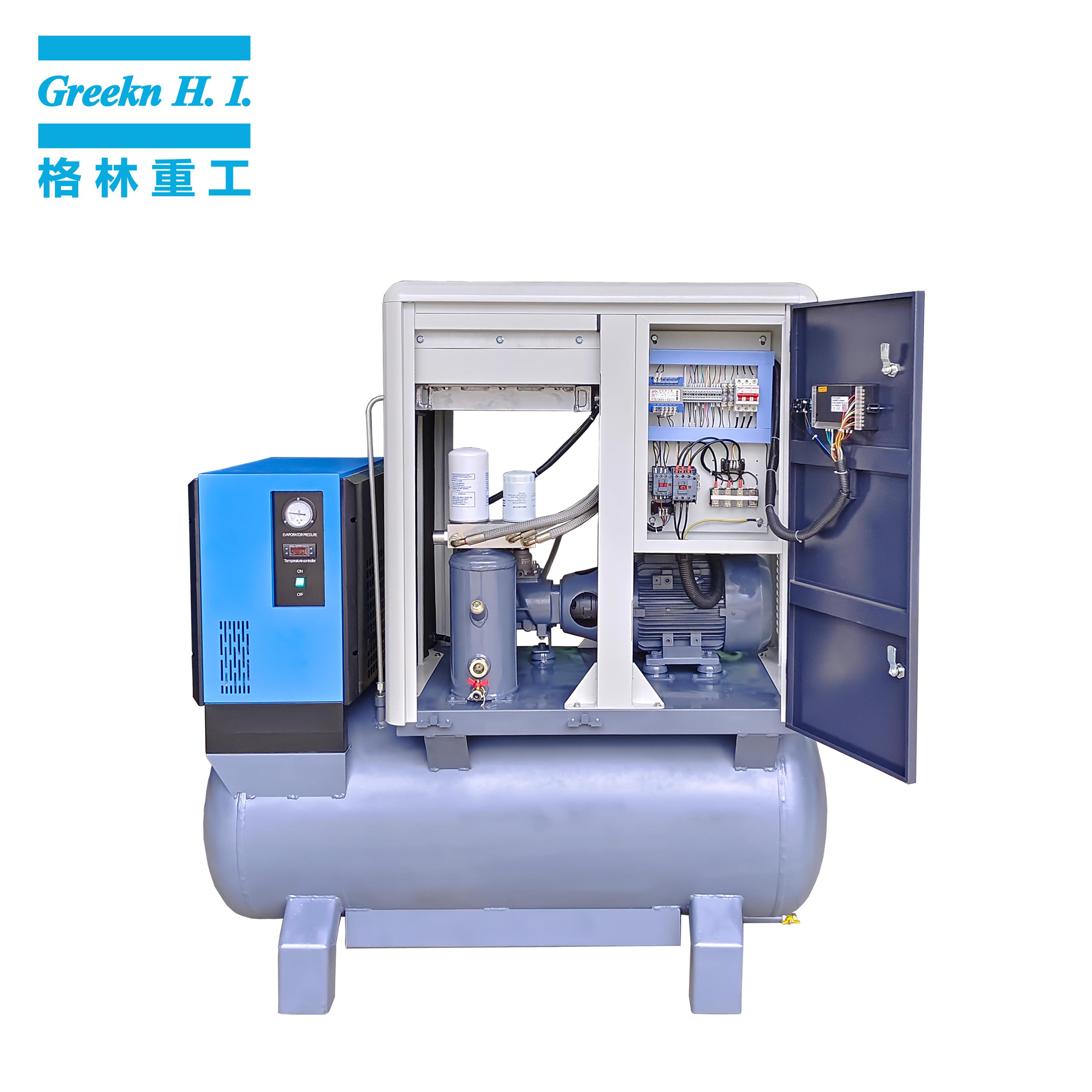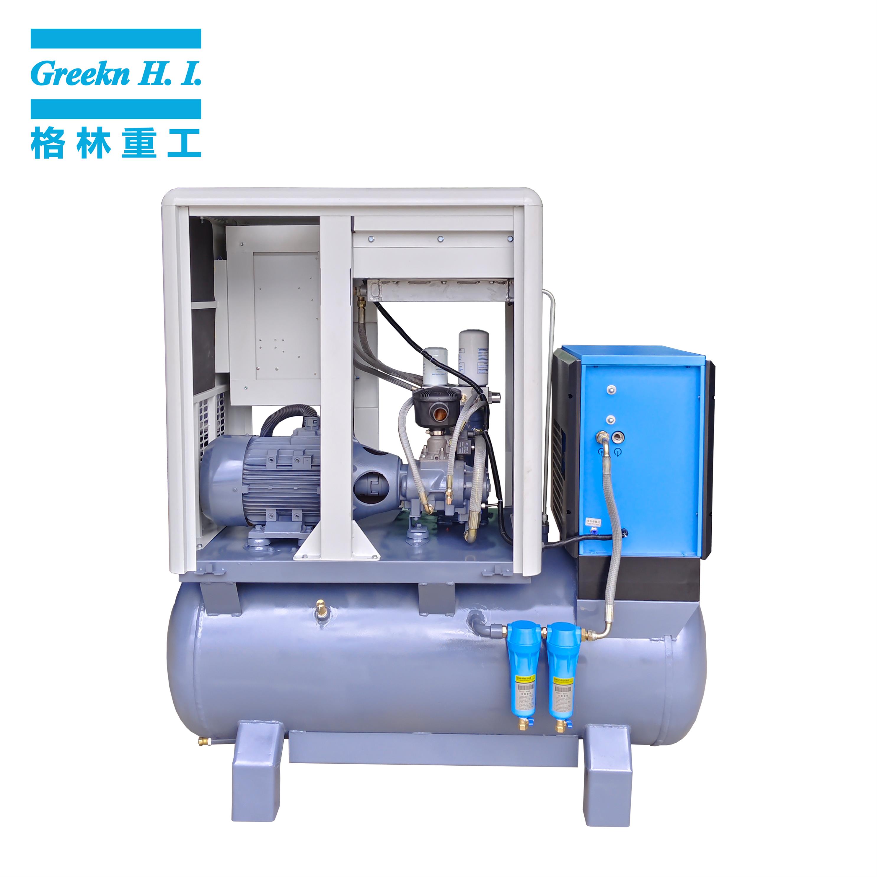集成式螺杆空压机,将空压机、储气罐、干燥机、精密过滤器等集成于一体,占地小,用户无需安装连接管路,移动方便,操作简单。